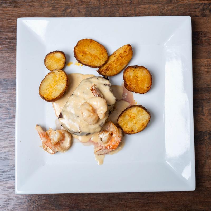 10-ounce Filet Mignon & lobster tail, in a natural au jus sauce, served with mixed vegetables and potatoes.